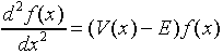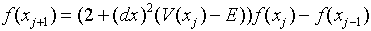Assign three columns (I used D, E, F) to position x, V(x) - E, and f(x) respectively. Label the columns in row 15, typing position x into D15, V(x) - E into E15 and wavefunction f(x) into F15. Now you are ready to put in some numbers. Type 0 into D16, then the formula =D16+dx into D17 (you must have already typed some numerical value into the square named dx). If you see the appropriate value coming up in D17, select (highlight) D17, click copy, and drag downwards about 600 rows (this will go fast if you drag hard). (Actually, you don't need to click Copy -- when you click on the cell, the black line around its border has an extra little square at the bottom right-hand corner. Place the cursor on that little square so that the cursor itself becomes a black +sign (as opposed to the usual Excel cursor of a white + sign with a black shadowed border). You can click and hold on that and drag it down to copy.) When all the cells you're copying to are black, just click to unhighlight the whole column.